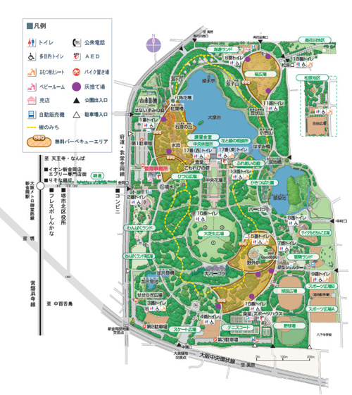 花壇、大泉池、大芝生広場などの憩いのゾーンと、スポーツゾーンなどからなります。園内の3つの池は鳥たちの水飲み場や遊び場となっていて、バードウォッチングにも最適です。