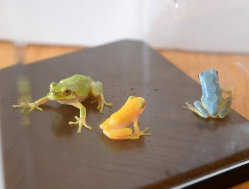 インターネットで調べたり、広島大の研究者へ電子メールで直接問い合わせたりした結果、金色のカエルは色素異常のアルビノで、青色は発生メカニズムが完全には解明されていないといい、ともに非常に珍しいことが分かったようです。